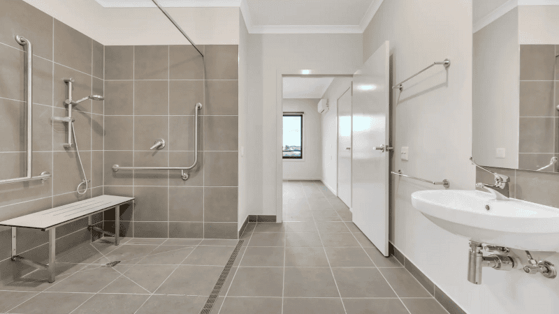 The bathrooms are thoughtfully designed with high-support features, including grab rails and non-slip flooring, making them safe and accessible for all users. The main bathroom and ensuite are equipped with modern fixtures and fittings, combining functionality with a touch of luxury